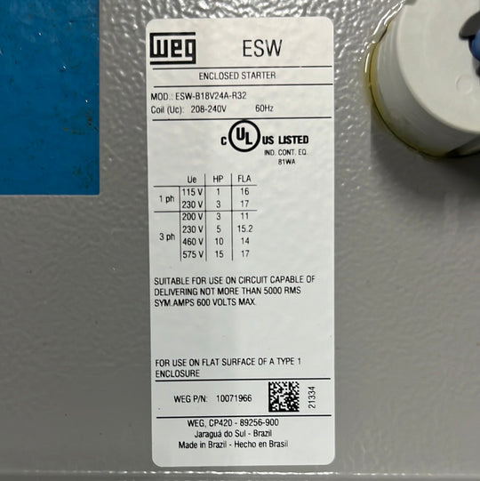 WEG 18A ESW-B18V24A-R32 Metal Enclosed Direct On Line Starter 60 Hz, , 18A (11-17A Relay Control) 240VRegular price $47,645.88Regular price $47,645.88 -