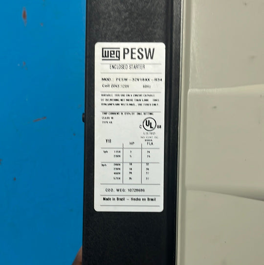 WEG Plastic Enclosed Direct On Line Starter 60 HZ, PESW-32V18AX-R34, 32 Amps (22-32A relay Control), 480VRegular price $42,916.28Regular price $42,916.28 -