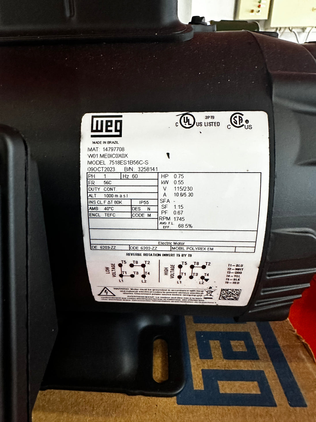 WEG 0.75HP 1800RPM 56C 110/220V Single Phase Rolled Steel C-Face mount