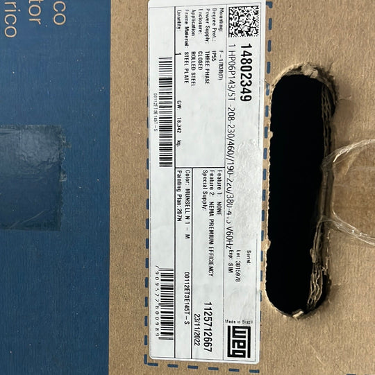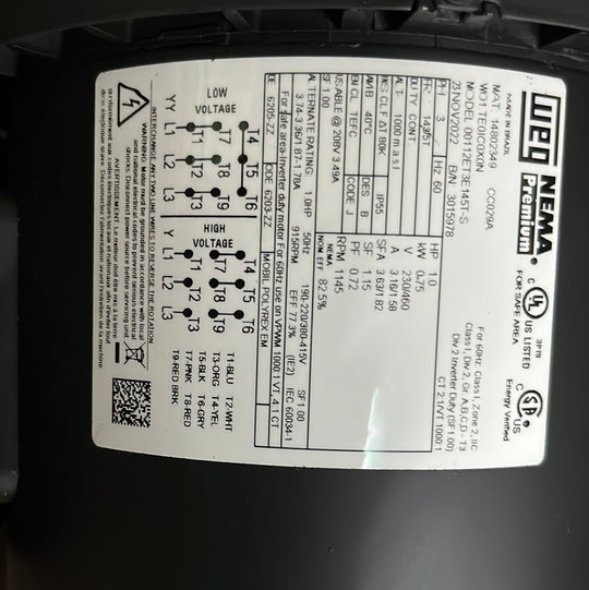 ELECTRIC MOTOR THREE PHASE 2 HP 06 182/4T 208-230/460//380 C/W 9 cables 60Hz B3R(D) IP55 EXPLOSION PROOF NEMA PREMIUM EFFICIENCY WFX1COOLING: TEFC TOTAL ENCLOS FAN COOLED;PAINTING PLAN: 202P;FINISH COLOR: RAL 5009;KEY: KEY A;SHAFT MATERIAL: STEEL CARBONO...Regular price $166,112.73Regular price $166,112.73 -