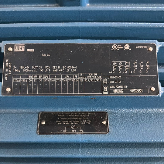 WEG 30HP 1500RPM, 180L, 220/440V 50Hz 3Phase W22
