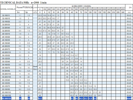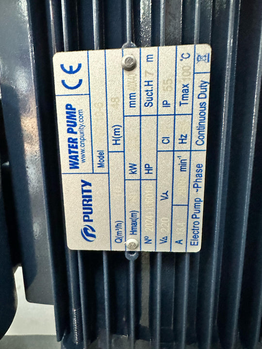 Purity 10HP 415V 50Hz 3PH Stainless Steel Centrifugal Pump 65x40 Port Q:24m3/h H: 53.5m